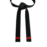 This top-tier 1st Dan Kenpo black belt is crafted for those who demand the finest in quality and design. Featuring a set of ½" red cotton stripes, precisely positioned 1" from the belt's end, it delivers a clean and distinctive look. Unlike embroidered alternatives, these stripes are made from 100% red cotton, adding a unique touch of authenticity.