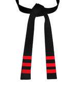 This top-tier 3rd Dan Kenpo black belt is crafted for those who demand the finest in quality and design. Featuring three sets of ½" red cotton stripes (1/2" space in between), precisely positioned 1" from the belt's end, it delivers a clean and distinctive look. Unlike embroidered alternatives, these stripes are made from 100% red cotton, adding a unique touch of authenticity.