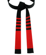 This top-tier 9th Dan Kenpo black belt is crafted for those who demand the finest in quality and design. Featuring a 5" red cotton sleeve and four sets of ½" red cotton stripes precisely positioned 1" from the belt's end, it delivers a clean and distinctive look. Unlike embroidered alternatives, these stripes are made from 100% red cotton, adding a unique touch of authenticity.