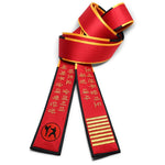 This highly-specialized Master & Shihan Belt requires expert craftsmanship, making it one of our best-selling master belts. The design features a sleek red inner panel on both the front and back, complemented by alternating black and gold panel borders on the outside.